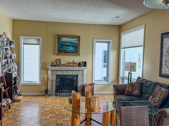 top floor corner unit is drenched in natural light, has a wood burning fireplace in the living room and