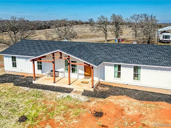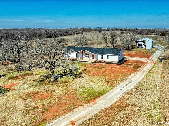 Come see this amazing 20-acre property and all it has to offer! The 2200 sq ft ranch style home was recently built in 2021 and features 4 bedrooms and 2 bathrooms, large walk-in pantry and laundry/mud room, beautiful farmhouse kitchen with farmhouse sink, stainless steel appliances, quartz counter tops, breakfast bar, and alder wood cabinets. All bedrooms are large and master bedroom has walk-in closet and master bath has a beautiful stand-alone tub. There is a storm shelter and Home has 20 acres, storm shelter, and an RV barn with 2 finished rooms, a bathroom, septic, rv electric hook-up, and washer/dryer hook-up great for guest or an Airbnb.