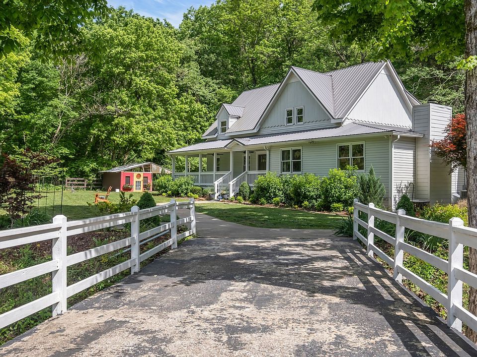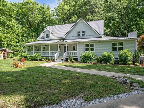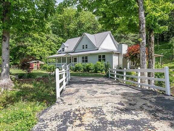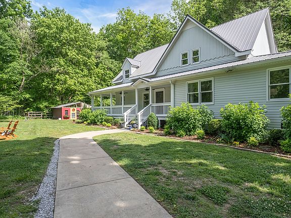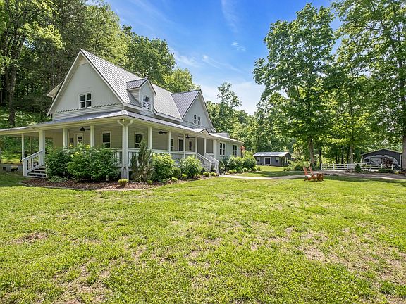 Nestled among rolling hills and lush fields, this modern farmhouse offers a tranquil retreat in the heart of the countryside. The charming exterior blends classic farmhouse design with contemporary elements. Upon entering, the dining room invites you to enjoy meals with guests or large family gatherings. The kitchen is a chef's dream, offering sleek appliances, quartz countertops, custom cabinets, and a large island. The spacious living room with natural light accents the hardwood floors. The stone fireplace invites you to enjoy cozy evenings with family and friends. Upstairs, the home features 3 tranquil bedroom retreats. The main suite has a spacious layout, walk-in closet, and en-suite bath featuring a tiled, glass enclosed shower. Two additional bedrooms, are designed with ample closet space. Convenience meets functionality with laundry rooms on both floors. Enjoy sunsets on the wrap around porch, and utilize ample storage with 3 outbuildings, all with electricity.