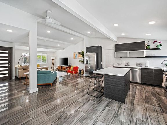 Experience modern Palm Springs living in this beautifully updated 4-bedroom, 2-bath home designed for seamless indoor-outdoor living. The open-concept layout highlights a sleek chef's kitchen with Quartz countertops, Italian cabinetry, and effortless flow into the dining and living areas, ideal for entertaining or everyday comfort. Porcelain tile flooring extends throughout, and the dining room fireplace adds warmth and ambiance.Energy-efficient features include dual-pane windows and sliders that welcome natural light while maintaining year-round comfort. The primary suite offers an ensuite and direct access to the backyard.The west-facing outdoor oasis captures panoramic mountain views and features a private pool and spa, custom desert landscaping, and three distinct lounge and entertainment areas.Located on FEE land (land you own) with no HOA, this property offers excellent flexibility as a full-time residence, vacation home, or investment opportunity. Furniture available outside of escrow.