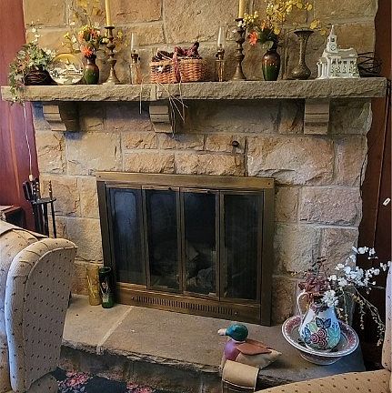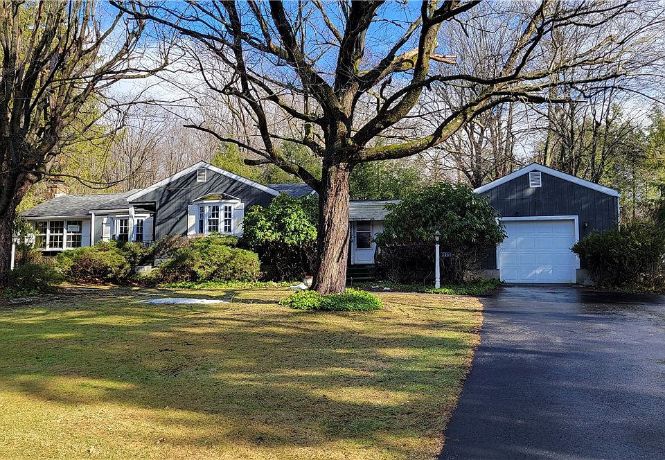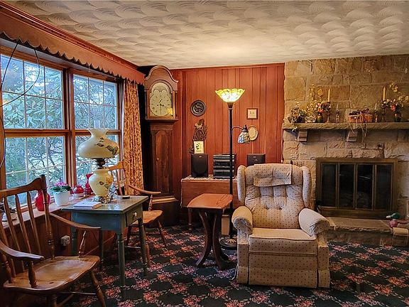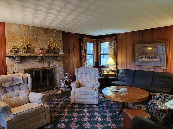 Sprawling ranch style home featuring a livingroom with a stone gas or wood fireplace, cherry t&g wood walls and a bow window. Separate dining room, cozy eat-in kitchen with appliances included, three bedrooms and a full bath on the main level. Sunporch breezeway that connects the one car garage. Lower level features an office area, recreational area, laundry, storage and a second full bath. Lots of mature bushes and trees. Shed for outdoor storage. Paved driveway.