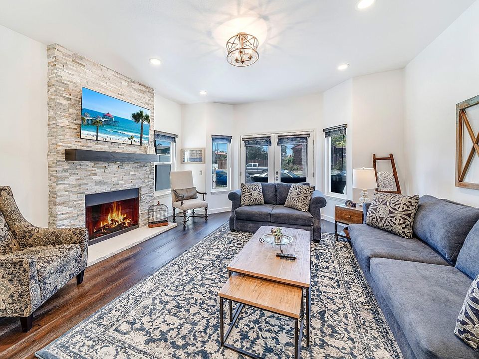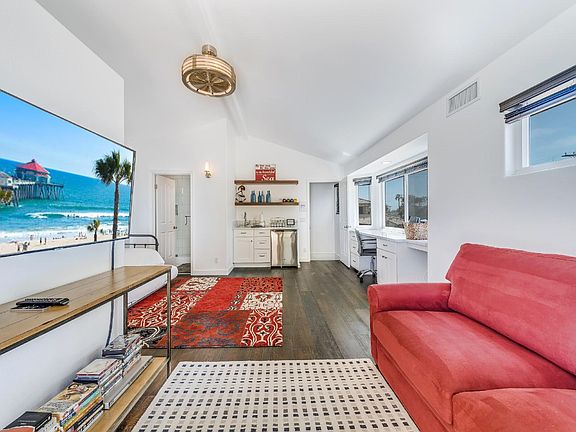 FULLY FURNISHED PROPERTY. We may not agree on politics but we can agree that The White House is stunning! THE WHITE HOUSE has an ocean view and rooftop Jacuzzi! It has been completely remodeled from the studs up! This amazing beach home has everything you could imagine to enjoy the oceanside lifestyle and is located 2+ blocks from the sand in Surf City, USA. This luxurious beach home has recently been tastefully redecorated throughout including Thermador appliances throughout the kitchen, high quality bedding, new mattresses, 3rd floor patio hot tub, whole house speaker system and 2 fireplaces. Enjoy an ocean view from the 3rd floor and catch some gorgeous sunsets! All that Huntington Beach has to offer is just blocks away. This home gives you easy access to the beach, sand, surf, dog beach, bars, restaurants, and shops. With the amazing weather in HB the city has done a fantastic job closing a portion of Main street to allow the restaurants to expand their outdoor dining and allow more social distancing. The nearby Pacific City also has excellent outdoor dining. Pacific City has 31 Acres of Oceanfront Dining, Shopping and Entertainment. HB properties--City of HB requires a 1 month min. please inquire for shorter stays at our permitted short term rentals. BEDDING: -Bedroom 1 The first master suite has a king bed, fireplace and a spa-like bathroom with a claw foot tub to relax at the end of a day of sun and fun. -Bedroom 2 The second master suite has a private entrance off the kitchen, king bed, private bathroom with a beautiful sky light that will let the morning sun and ocean breezes through. It has an adjacent room with a twin daybed and trundle. -Bedroom 3 Third bedroom has a queen bed with a private full bath and a crib. -Bedroom 4 Fourth bedroom is equipped with a twin daybed and trundle, a queen sleeper sofa, a built in deck, wet bar and mini fridge, a private bathroom and direct access to the 3rd floor patio where you can soak in the hot tub as you watch the sunset on the Pacific. You will enjoy the short walk to downtown, restaurants, shopping and the famous Huntington Beach pier. Of course the best part of this beach home is that you are just 2 blocks to the sand. Whether it is cooking an amazing dinner in the state of the art gourmet kitchen, relaxing with a glass of wine on the front patio, or watching the stars from the 3rd floor patio while soaking in the hot tub; no matter how you choose to unwind from a fun day at the beach this home is the perfect answer. Call today and book your perfect family getaway and create an unforgettable vacation!! IT'S PERFECT FOR 2 FAMILIES OR GRANDPARENTS JOINING ON VACATION. MAX OCCUPANCY OF 12 (8 ADULTS) We will consider 4 additional children for a total of 12 per group. Please ask us first there may be additional charges. We can discuss the possibilities with you, but we need you to communicate any requests over 8 adults. We do charge $25 per person per night after the 8th person if we agree to the larger group. AMENITIES: Electric car charger in garage, New Furnace, New Waterheater, Fireplace (2), Internet/Wifi, Washer & DryerGarage, Parking, TV, Hot Tub/ Jacuzzi, Outdoor shower, Apple TV, Surf Boards, Boogie Boards, Bikes, Beach Chairs,Beach Towels Provided, Iron Hair Dryer, Whole House Vacuum, Whole House intercom/Radio, Microwave, Coffee Maker, Toaster, Dishes & Utensils, New Thermador Refrigerator, Range, Hood and Dishwasher Blender, Pots/Pans Mixer, Crock Pot, Games, DVDs, Ceiling Fans and Room Fan, No Air Conditioning and no need, the Pacific Ocean is our AC, crib. As a local I have never had AC in HB for 50 years you just do not need it and you will see that less than 20% of the homes advertised this close to the beach have AC. It stays very cool this close to the beach. HOUSE RULES: --11:00pm curfew in outdoor areas. --After you reserve we will have you sign our rental agreement online, below is a summary of our house rules. --You must be 28 years of age. If you are less than 25 years of age an additional damage deposit will be applied if we decide to accept your reservation. NO PARTIES: --No parties/ gatherings without permission or excessive noise allowed or you will forfeit all or a portion of any charges or Refundable Damage Deposit. --No excessive noise or gathering outside after 9 pm. --No extra people than the people in your group listed above. NO SMOKING: --All of our properties are NO SMOKING. --Evidence of smoking or vaping inside of home can result in loss of damage deposit. NO PETS ALLOWED There is a garage on property. BIKES AND BEACH GEAR: -5 adult bikes 2 kids bikes -5 camping chairs -fridge -2 skateboards -2 bike locks -5 boogie boards -1 pair of fins/flippers -3 surfboards -1 wetsuit -1 soccer ball -1 football -1 two step ladder -broom and mop -bike pump -inner tubes for tires (high shelf) -1 white plastic chair FULLY FURNISHED PROPERTY. We are offering this home for temporary housing.