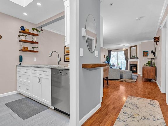 Welcome to this well-laid-out 2-bedroom condo, perfectly situated in the heart of Central Port Coquitlam, with a serene park view. Top floor unit with skylight for extra natural light. Featuring an upgraded kitchen with quartz countertops and an open-concept design, this home offers both comfort and style. Enjoy cozy evenings by the gas fireplace (gas included in the strata fee). Steps from restaurants, schools, and shopping, the location can't be beat. Includes parking stall #21 and storage locker #18. Don't miss your chance to view this gem—Open Houses Thursday Jan 16 (3:30-5:30pm) Sat/Sun January 18/19, (2-4pm)