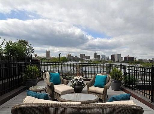 Elegant two bedroom plus library/3rd bedroom with breathtaking views of the Charles River.Spacious duplex property with grand living room and dining room,spectacular private deck.Library w intricate wood paneling & fireplace w marble mantelpiece,luxurious bathrooms with custom grasscloth wall paper and frameless glass shower doors. Chef's kitchen features Subzero refrigerator & granite counters.Stunning Master bedroom with French doors leading to an outdoor oasis. Two deeded garage parking spots