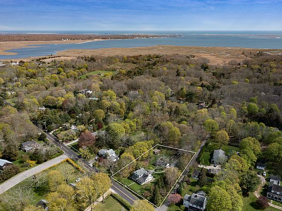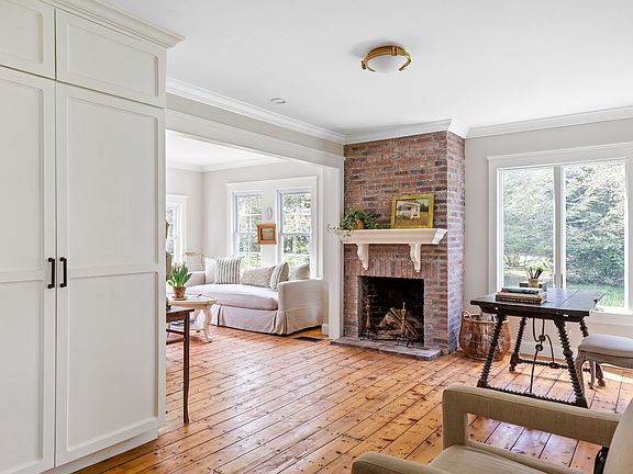 Built in 1872, this quintessential Brookhaven Hamlet farmhouse embodies understated historic elegance at its best. The Hawkins House is nestled on a shy acre in the Hamlet's most desirable location. This impeccably maintained turn-key home still retains many of its charming period features, including 4-inch wide plank pine flooring, antique doors and original millwork and hardware. A spacious covered front porch with seating area invites you to this historic home. The first level features a light and airy living room with a wood-burning fireplace as well as French doors leading to an intimate back patio. Just beyond is the stylish, recently updated eat-in kitchen with center island with seating, stainless steel appliances, farmhouse sink, marble counter tops, and a breakfast nook overlooking the beautiful backyard. This is the perfect spot for morning or casual meals. Just past the kitchen is the formal dining room with a fireplace. A full bathroom with a soaking tub completes this level. An elegant staircase leads to the second level which hosts the large primary bedroom with seating area, a cozy guest bedroom with original built-in cabinetry, and a recently renovated full bathroom. The enchanting backyard exudes rustic charm and truly reflects countryside living. It features a wisteria-covered pergola for al-fresco dining and entertaining, a duck pond, a garden folly designed by a local artist, a chicken coup and a lovely raised-bed vegetable and herb garden. This unique home is complete with a 1-car detached garage with a covered-porch. Offering endless possibilities, steeped in history and charm, this home will transport you back in time to a simpler life. Come and experience a little piece of tranquility just 2 miles from Bellport Village and 60 miles from NYC.