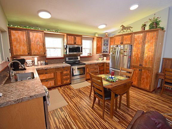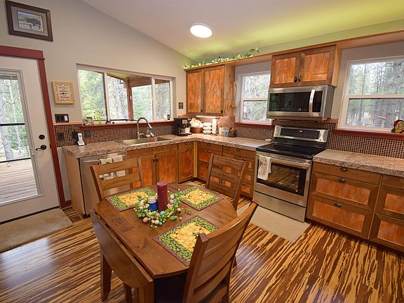 ONE-OF-A KIND high quality Shop/House on the Moyie River on 1.26 ac !! The 1152 sq ft home is quality, custom built from beginning to end. The upstairs living area has the kitchen, living room ,2 bedrooms ( 1 w/ a murphy bed), laundry closet and a full bathroom. The living room w/ a built-in entertainment center opens on to a large deck overlooking the river. The well-lit kitchen contains stainless appliances & railings , custom copper faced cabinets and bamboo tiger wood flooring throughout. The spacious full bath has a walk-in tile rain shower & tile counter top vanity. Main level houses a fully finished office/bedroom with a river view + a garage. There is lots of storage and built-in cabinets. The owner is the builder and the floor plan was well thought out.