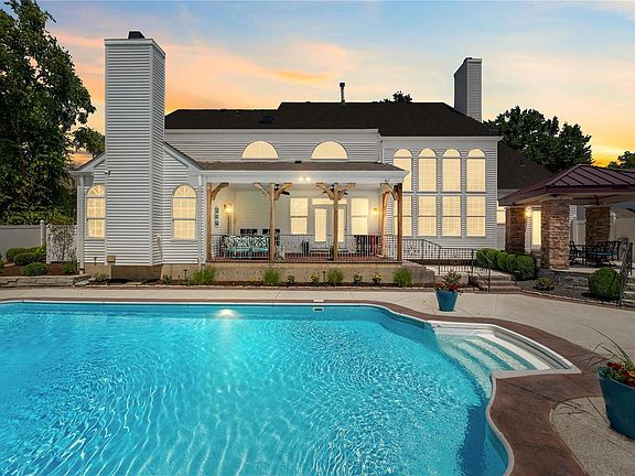 Inside, find breathtaking two-story ceilings in the great room and a cozy hearth room. The Flower-built home showcases an open-concept design with 9-foot ceilings on the first floor. The Thermador 6 burner gas range in the kitchen is perfect for the home chef. The spacious main floor primary suite includes tray ceilings & French doors that open directly to the pool. The first floor also accommodates a home office, laundry room, and two half baths. Upstairs, discover a loft area & three additional bedrooms, each with private bath access. Finished Lower level w/family/rec room and a full bath. 3 car side entry garage, Zoned HVAC, Wood Floors, Sprinkler System. This home is both functional & elegant. Rockwood Schools. Minutes to HWY 141 access.