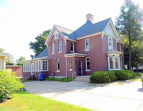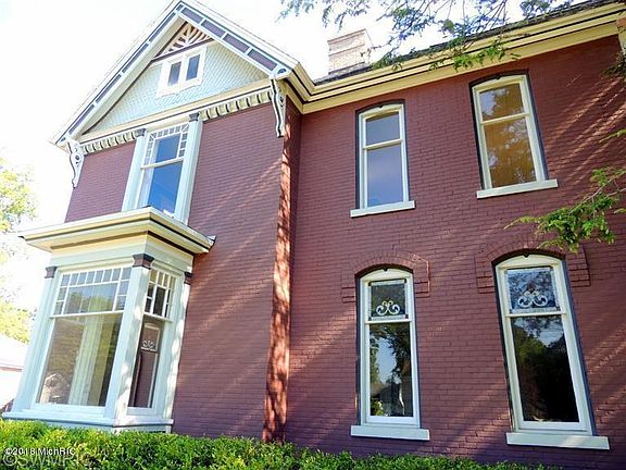 Wonderful Victorian, rich with history! Home offers original woodwork throughout, stained glass windows, a spacious updated kitchen with island, newer appliances, formal dining room w/spectacular hand crafted floor, master bedroom with private bath, den, large great room with bay window & fireplace, large nostalgic porch/3 season room. The 2nd floor features 3 bedrooms, utility room & full baths- one is very large with a claw foot tub & sitting room. The 3rd floor is a partially finished walk up attic with a huge brick chimney in the center - endless possibilities for expansion. 2 stall detached garage. Large fenced back yard plus a cement drive with turnaround area. Close to downtown, parks, and Flat River Trail