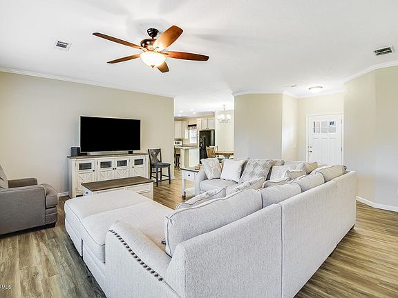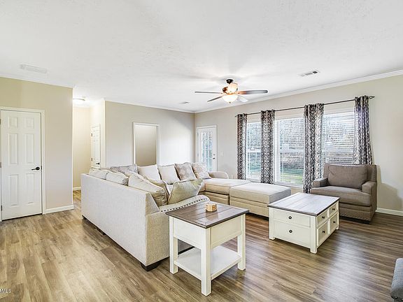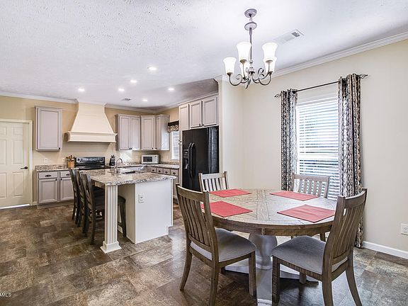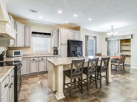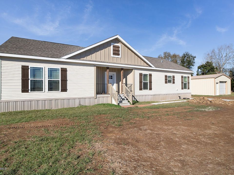 Modular home ''LIKE NEW'' on a slab sitting on almost 4 acres! Home is barely lived in and not a nail ever put in the walls! Living room offers laminate wood flooring. Kitchen is equipped with an electric range oven/stove, dishwasher, refrigerator and lots of storage cabinets. The kitchen island has a sink, and more counter space with additional seating. The pantry has a barn door giving the space a farmhouse look. There's a separate computer area with additional storage cabinets. The large walk in Utility room has a closet and a rack above washer/dryer area. The master suite has it's own bathroom with dual vanity sinks, separate shower/soaker tub, and a walk in closet. Crown molding throughout! Exterior has a freshly poured driveway, and 20x24 insulated steel building!