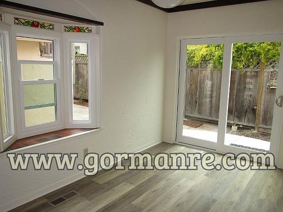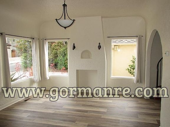 Wonderful architectural charm to this 3 bedroom 2 bathroom home. Approximately 1,275 square feet of living area on two levels. Fresh interior paint and new carpeting. Downstairs includes all rooms except the master bedroom suite, which is upstairs, using a spiral staircase. Living room, dining area and kitchen all feature new luxury vinyl weathered-wood style flooring. Kitchen features beautiful custom wood cabinets, quartz counters, a refrigerator, a self-cleaning gas range/oven, a dishwasher, and a disposal. Laundry area in garage features hookups for washer and electric dryer. Both downstairs bedrooms and the master suite upstairs feature new carpeting. The master suite also features lots of closet space and a very nice master bathroom with a large shower stall and beautiful double vanity. The two-car detached garage that may not be large enough for some cars and front doors are heavy sliders, so mostly likely would be used for storage only. There is off-street parking in the driveway. There is also lots of additional storage in a room above the garage. Rear patio area with brick walkway. Rent includes sewer. No smoke/pets.