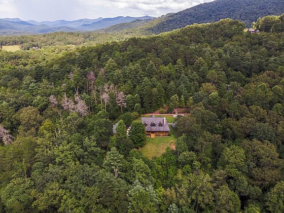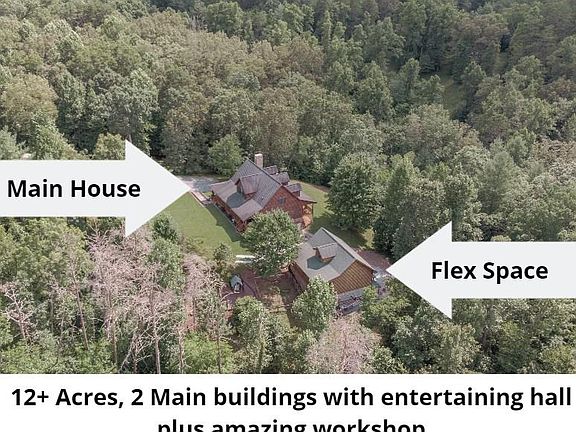 Private log home with a 3 sided wrap around porch. Enter thru French doors into the dining room, then the living area to the left w/ a stack stone gas log fireplace w/ Maple flooring. The kitchen has tile floors, custom white hickory cabinets, tile backsplash, an island, pantry & breakfast nook. Also on the main level is the master en-suite w/ stack stone & tile walk-in shower & shoe closet. The upstairs floors are Hickory w/ 2 lg. bedrooms containing built-ins for storage, plus additional storage behind the closets. Also a bonus room w/ lots of natural light that would make a great office or craft room. In the basement is the family room w/ vinyl plank flooring, shiplap walls & ceiling and a stack stone fireplace plus another full bathroom. The other half of the basement is a large craft room and lg pantry w/ freezer. Two other buildings on the property: one currently called the "Party House" is 31 x 23 w/ vaulted ceilings, hardwood floors, 1/2 bath & kitchen area & below is a dream 600 sq ft workshop; the second building is a "treehouse" w/ hickory frame, windows and laurel railings around the porch. Only 5 min from town!