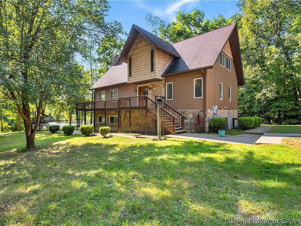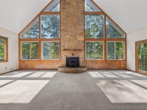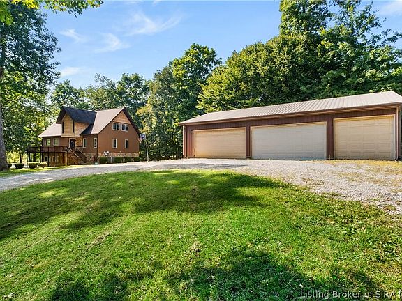 "Gatlinburg" style chalet on 10 acres located on a 28 acre lake w/a detached 6 car garage with electric. This wooded private homesite w/ lake access is a hunters and nature lovers dream. 3 bedrooms, 3 full bathrooms, Bonus loft. Full walk/out basement large family room and game / rec room. Double fireplace with creek stone hearth overlooking the lake. Less than 30 minutes to Louisville kentucky.