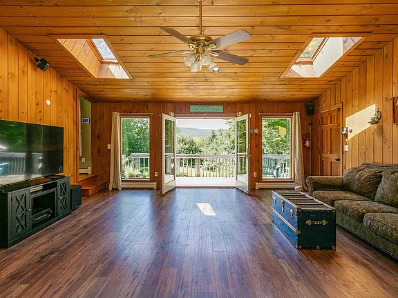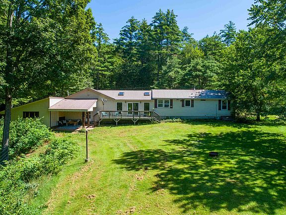 Gorgeous Views from this Beautifully Updated New Hampton Ranch with 2 Garages, Horse Stalls, Fence, Shed, Garden, and Patio on just under 4 acres! The main garage holds two cars wide and the additional garage is deep and is currently set up as a very clean barn with stalls and an additional garage door out to the back yard. The back yard has a fire pit and fenced off horse pasture area, then slopes down into the woods. You will love the view from the family room with new laminate floors, vaulted wood ceilings, and french doors that open to the back deck. The dining room is open to the living room as well as a large opening to the kitchen, has a bay window, and the stone wall and hearth are perfect for a wood or pellet stove. The kitchen has hardwood floor and a good sized island with cabinet storage underneath. There is a dishwasher, but you may want to hand wash your dishes just to soak in that mountain view from the sink! The bathroom is newly renovated with new toilet, vanity, and fixtures. Both bedrooms have new flooring and the whole house is recently painted inside. The primary comfortably holds a king bed and has two closets. The basement is huge open unfinished space ready for your ideas or storage. Come experience the single level living and quiet serenity and privacy that this property offers, with close proximity to Meredith and the Lakes Region, as well as access from the highway. Showings start Saturday 8/26 by appointment only.