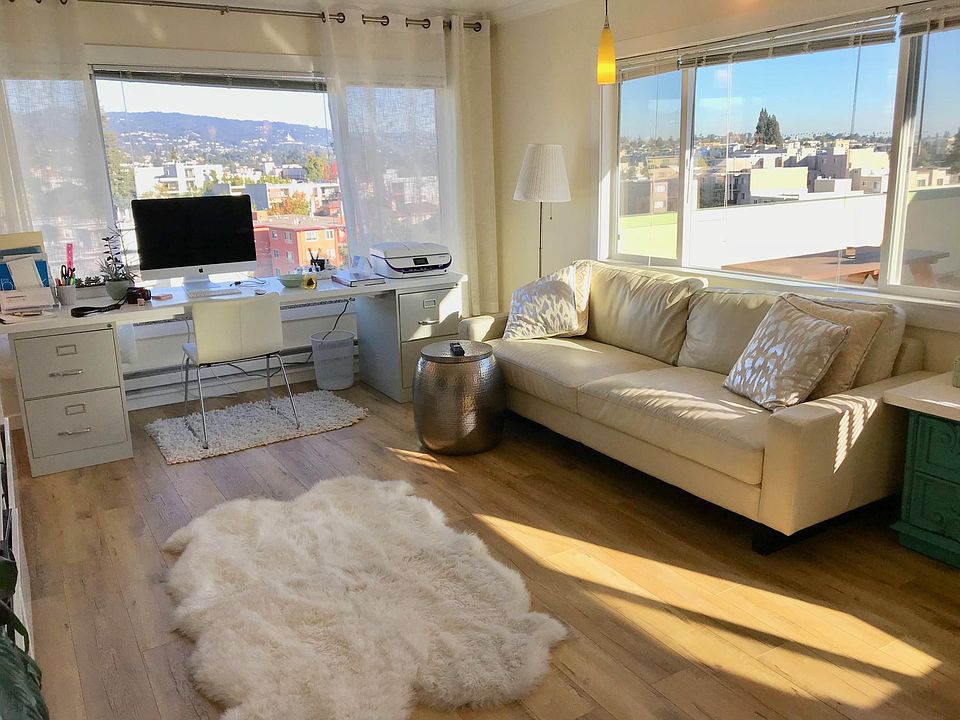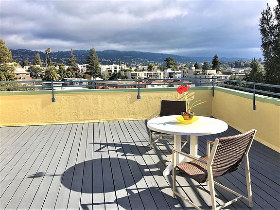 ...ADAM POINT'S FINEST DRAMATIC VIEW PENTHOUSE + 500 s.f. PRIVATE DECK ...No other intimate apt & personal deck like this one. Welcome to the beautiful and calm Bel Aire Courtyard Apts. Private sky view deck is for this penthouse itself. Exceptional history of tenant safety...security cameras + very watchful manager. This penthouse is comparable to an owners luxury condo...quiet, no walls shared with other tenants, fabulous long distance mountain views + Eastern morning sun. A closely managed and very personal building recognized to be safety conscious...clean...stylish ...concierge like on site manager. Live up high in with fresh air in this condo like apt living with one of the largest beautiful decks you might dream of finding some day. Safety aware mgmt- 24/7 security cameras in common areas. See why Facebook and Zillow did important photo shoots hear and feature our kind and considerate manager. This top floor corner penthouse is beautiful and peaceful just like an owners condo. We are known to be an exceptional 5 - Star building with honest and un-coached reviews at yelp.com. Our community, the Bel Aire Courtyard Apts has a very personal and intimate feeling and is cared for by on site mgr. Uncle Ming who is in fact our mayor and recognized as low key, watchful and very much a concierge in a moment of need. ...See a charming drone video of our building at ... Our respected location at Adam's Point is 2 blocks from Lake Merritt and 3 blocks from the one of the most amazing Whole Foods stores ever built. We take cats and behaved dogs 30 lbs or less and offer gated garage parking that is watched 24/7 by motion sensor cameras that record all visitors for 30 days then the video is removed . ............OUR UNIQUE BENEFITS...in our personal +intimate community- 31 apts * ...We are a safety aware building-exceptional attention from our on site mgr. * ...Amazon package lockers opened by your personal code number. * ...Adam's Point neighborhood has an exceptional more calm reputation. * ...Bel Aire Courtyard Apts has 21 honest and un-coached- 5 star yelp reviews * ...16 motion security cameras record 24/7 in common area. * ... New laundry room ...smart phone operated...never need coins * ...Strong inexpensive internet for $35./ mo * ...Our caring on site manager is your concierge in an moment of need * ...Garage parking that is camera monitored is brightly lighted 24/7 * ...EV parking can be arranged at a reasonable cost * ...Huge private view sky deck attached to this apt is only for this penthouse. * ...Our tropical palm tree enclosed courtyard may remind you of Hawaii... very tropical feeling and a peaceful place in our very personal community. * ...This quiet corner high up penthouse is calm a living unit as peaceful as you can find in all of Oakland. Beautiful sunrise views. * ...See 21 + 5 -Star un-coached and honest reviews plus 100 photos of our building: Tenants to have a credit score approximately of 750, positive past housing references and an income of 3 x the monthly rent. Tenant to be able to sign and complete all lease documents and verification within 72 hours of agreeing to rent penthouse apt. Tenant puts PG&E electrical in their name and pays a flat fee with rent for hot and cold water, sewer, trash and recycling. This is a registered no smoking building, garage parking is an extra fee. application to rent and run credit is a $35. one time fee. Pet policy: Cats $35/mo or two for $50. Small dogs under 30 lbs $65/ mo.