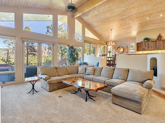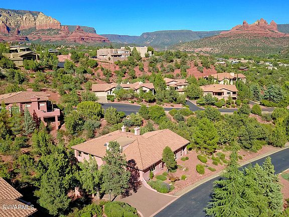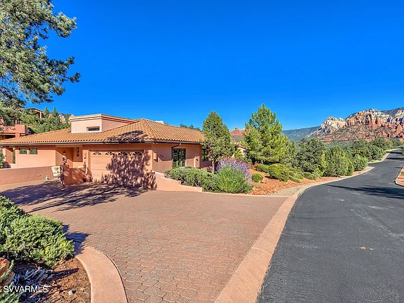 Open the doors to Iconic Sedona Views seen through towering windows. Only the very best materials for NEW bathrooms: cabinetry, countertops & shades; Kitchen upgrades include: Bosch, KitchenAid, Samsung & Kohler, Counters & Cabinets. GREAT Rm living all on Main floor, w/ lighted steps down to grand living room: Stunning kitchen, easy dining, guest suite, laundry & primary bedroom suite with double sided fireplace & spa bath. EVERY room boasts a deck & view. Enjoy privacy of the office/4th bedroom & guest suite below, each w/ sheltered patios offers quiet respite. Relax in your hot tub under the stars at night. Gated in PRIME W SEDONA Location w/fitness, pool, pickleball.