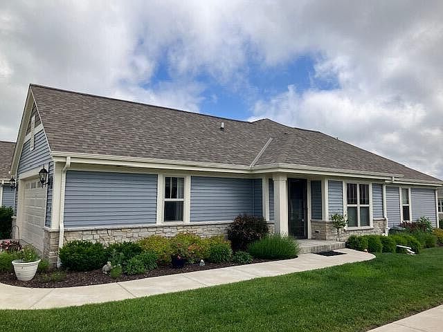 Beautiful, well-kept condo built in 2019 across the street from the village park. No step entry at garage door. Open concept. Extra wide hallways and doorways. Gourmet kitchen with pantry. Sunroom adjacent to living room. Covered outdoor deck. Private bathroom off of primary bedroom includes low shower threshold. Upgrade features include finished garage, fresh interior paint, water softener, ceiling fans and blinds. Clean, dry basement with 8 ft ceilings stubbed for bathroom, includes radon mitigation system, and is ready for finishing. It is evident that this condo has been well cared for by the original owner. Enjoy a lifestyle free from yardwork! Requires 80% of homeowners 55+