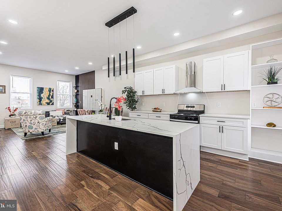 EXTRA WIDE END OF GROUP RENOVATION WITH 4 FINISHED LEVELS, DESIGNER FINISHES & OFF STREET PARKING!  Features include wood flooring throughout, an inviting living room with a dining area, designer island kitchen with Quartz counters and ss appliances, upper 2 levels with a total of 4 bedrooms and 2 full baths, convenient bedroom level laundry, a fully finished basement with a family room, 5th bedroom or office, and a 3rd full bath, a private rear yard, and a parking pad.  Eligible for 10k Vacants to Value grant and 10k in closing cost assistance through the Southwest Partnership!  Tons of renovations happening on this block and dropping interest rates make this a great time to buy!