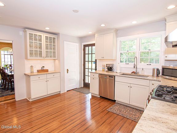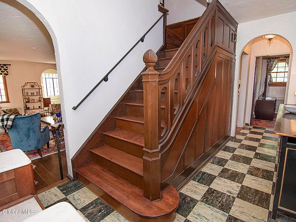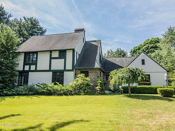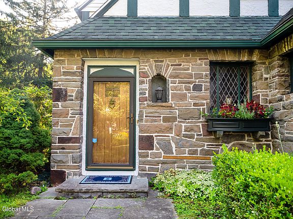 Classic Loudonville Tudor in quiet Upper Loudon neighborhood. Fully updated kitchen with custom cabinetry, granite counters, and stainless-steel appliances add modern amenities to this classic, charming home. Large living room with nine-foot ceiling and custom stone fireplace, spacious dining room, inviting sunroom, and office or guest room with adjoining half bath. Updated bathrooms with new fixtures and freshly painted. Basement family room features a second stone fireplace. The inviting exterior includes a sunny patio, covered porch, and pergola that are all perfect for relaxing or entertaining. The large, private yard is fenced and accented with flowering trees, perennials, arborvitaes, & water feature provide a perfect oasis. Driveway on Upper Loudon Rd