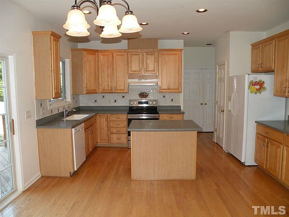 Great schools! Brick-front home w/ open floor plan. 2-story family room. Formal dining room, living room & office. Hardwood floors. Large kitchen w/ breakfast area, island, Corian counter tops, & lots of cabinetry. 4 bedrooms & a bonus. Master bedroom w/ vaulted ceiling. Master bath w/ two walk-in closets & separate shower & tub. Huge private & flat backyard is fenced. Convenient to RTP, RDU, golf course, shopping centers, parks & major highways. Fridge & W/D. Verify schools if important.
