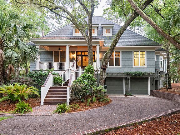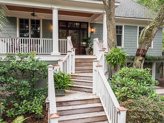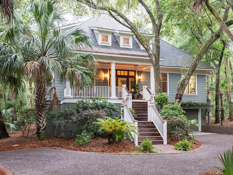 This classic Lowcountry residence was designed by architect Sam Furr. Ensconced in live oaks and palmetto trees the naturally hued green Hardi-shingle-styled home has white accents that fit in perfectly with the surroundings.