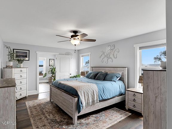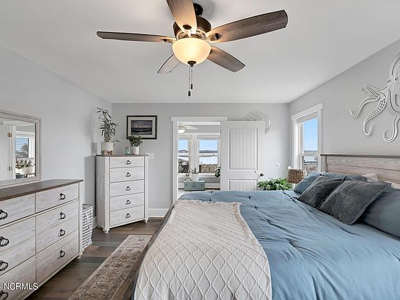 Step into the master suite for the perfect space to unwind and watch the sunset over the water from the sitting room. The laundry is thoughtfully located within the master bathroom, combining utility with luxury. This clever design ensures life's necessities are just steps away, allowing for a seamless transition between rest, refreshment, and relaxation. The two additional bedrooms are located on the other side of the home and offer flexible space for family, guests, or a home office.