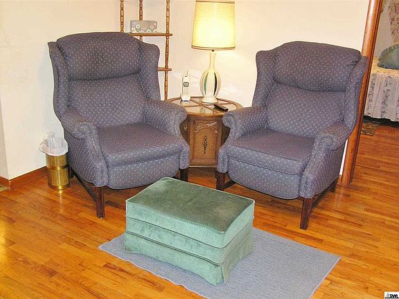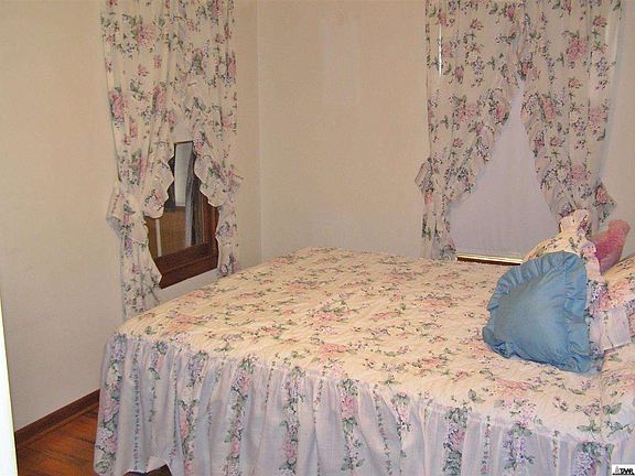 Cozy 2 bedroom on approx. 2 acres-total of 26 city lots. Well maintained, hardwood floors, living & bedrooms, nic kitchen with lots of cabinets. Upstairs "play room", vinyl siding, 14x8 covered front porch. 14x6 covered east porch, main floor laundry, enclosed west porch, 24x36 garage w/partitioned 11x17 shop.