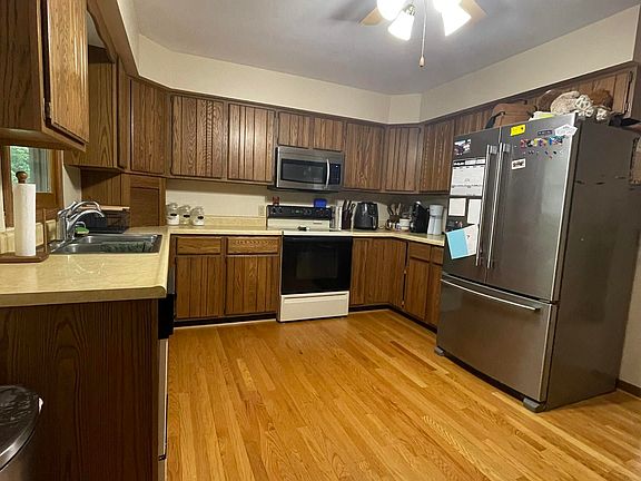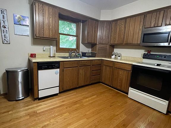 This large ranch home has many things to offer. 2 bedrooms, full bath, eat in kitchen, beautiful fire place, bonce room could be formal dining room or family room that leads out on to deck overlooking large back yard. The basement offer, tv/movie room, full kitchen and 3/4 bath, large storage space, and the extra large 2 stall garage is a must see. Roof, sliding glass door and several windows new in 2016-2017. Call your REALTOR today to take a look.