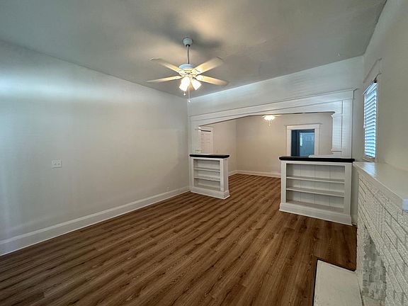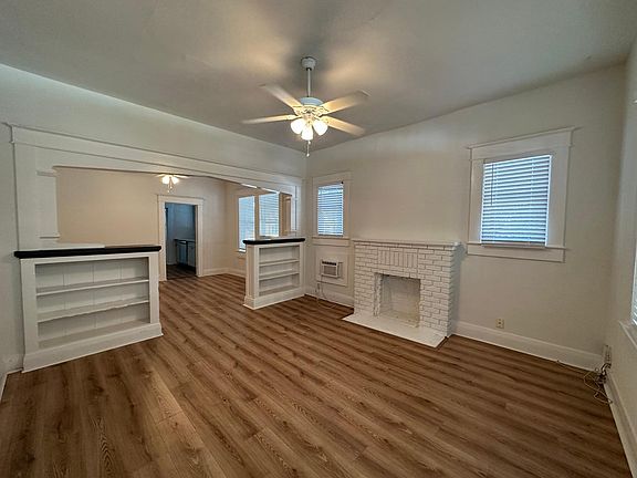 This unique studio offers an open concept with thoughtful design. While there's no bedroom door, built-in bookshelves create natural separation, adding privacy and character. High ceilings, a faux fireplace, and large windows bring in natural light, making the space feel airy and inviting. Step outside to your large covered porch with a swing perfect for relaxing with your morning coffee.