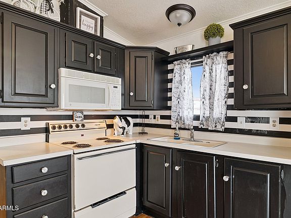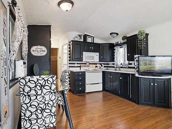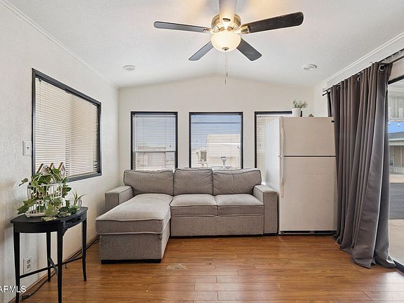 Discover your new home in this fully furnished manufactured residence nestled within a vibrant senior community offering fantastic amenities! Soaring vaulted ceilings, ceiling fans, and stylish laminate wood grain flooring create a welcoming atmosphere. The kitchen boasts a built-in microwave, perfect for quick meals. Your monthly lot rent simplifies life by covering water, sewer, trash, and electricity. Enjoy relaxing moments at the pool just a short stroll away. The home features a cozy refrigerator, washer, and dryer packed and ready for move in. Step outside to a charming patio area, ideal for outdoor gatherings. The second bedroom is comfortably housed in the inviting Arizona room. Additional conveniences include a covered carport, awning, and nearby parking options.