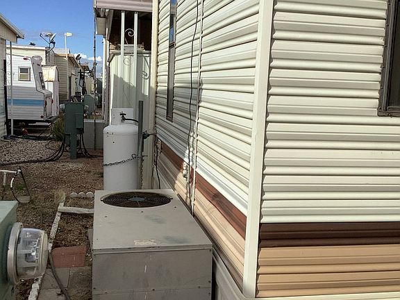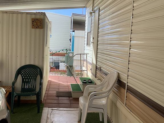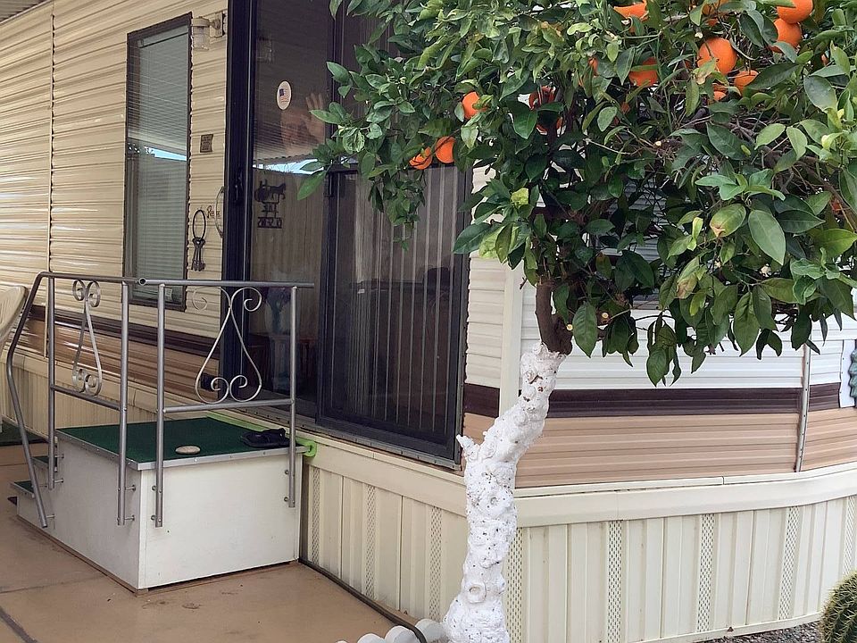Beautiful well kept park model. The house needs nothing, come with your toothbrush and make this your home. Included in the sale is a large sofa dinette table and queen size bed. Wooden light brown flooring throughout home and updated kitchen with a large sink. The outside shed is home to the washer and dryer. Beautiful community in east mesa. Central ac and heat and located a few steps to the community pool.