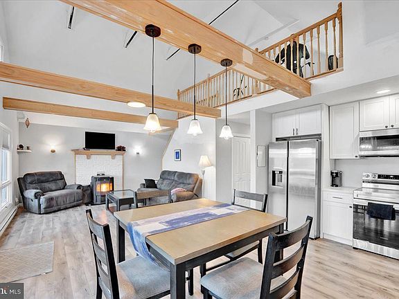 Sleek quartz countertopsCrisp white cabinetryWarm wood stoveVaulted ceilingsUpdated bathroomUpdated kitchenStainless steel appliances