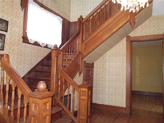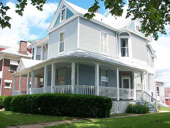 Beautiful Victorian...4 bedroom, 2 bath with charm and character. Room to roam with dining room, family room and sitting room with fireplace. Small room would make great office space. Additional space in attic along with a cedar closet. Many unique features include bay shaped rooms, hardwood floors, 2 stair cases, 4 sets of pocket doors, French windows upstairs and in kitchen and some new storm windows. Safe room in basement. New roof in 2006 and new heat exchanger in winter 2014. Zoned business...would make great bed & breakfast. Across the street from Library and in view of Sacred Heart School and church with off street parking. Must see to appreciate everything this home has to offer.