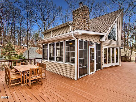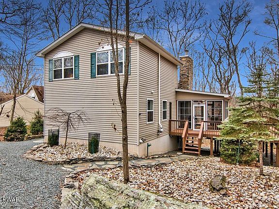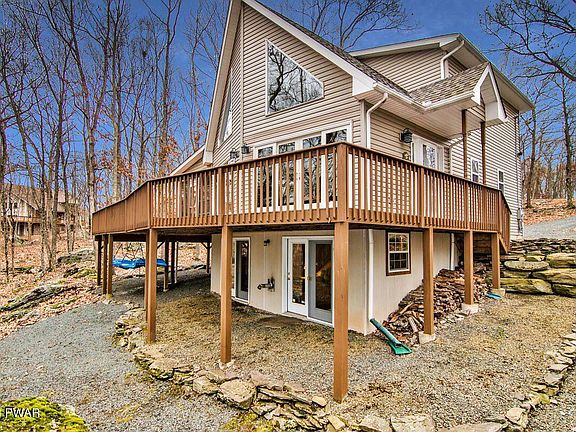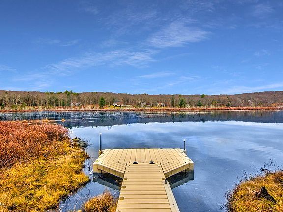 Rare opportunity to own a Masthope lakefront on double lot with 165ft of lake frontage. Follow the path to your floating dock with direct access to motor boating lake granting easy access to boating, personal watercraft, canoeing and paddle boarding. Well maintained home features 3BD, 2BA, loft area, finished basement, hardwood floors, wood burning fireplace, upgraded kitchen, (2) split units, EZbreeze sunroom, massive deck, newer roof, pellet stove, oversized shed and 1.34 acres for future expansion. Home is being sold mostly furnished. Masthope amenities include skiing, motor boating lake, white sandy beach, ATV trails, cross country ski trails, fitness center, lodge, outdoor pool, mini golf, tennis courts, market place, restaurant, horseback riding and Delaware river access and park., Beds Description: 2+BED 2nd, Beds Description: 1Bed1st, Baths: 1 Bath Level 1, Baths: 1 Bath Level 2, Eating Area: Dining Area, Sewer: WS Comm Central