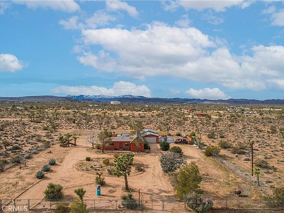 Turn-Key Fully Furnished Amazing Opportunity To Own A True One Of A Kind Property! Nicknamed "The Rusty Jackrabbit" and Nestled on a MASSIVE 5 acre fenced lot with in the popular Yucca Mesa area this is one you won't want to miss! This authentic curated home is filled with sunlight from giant wraparound dual pane windows with exposed brick walls, concrete flooring, a giant deck, and large stone fireplace that anchors the great room. This is an original homestead property built in the fifties and with MATURE trees - pine, juniper and of course lots Joshua Trees. As you pull up to the grounds you immediately notice the lush landscaping and captivating panoramic views - you can see for miles and miles in absolute privacy, without interference , the desert in all its glory. The main house has 2 bedrooms 2 bathrooms overflowing with character! The kitchen opening up to the living area makes this home ideal for art making, relaxing, or entertaining. It's equipped with new butcher block counter tops, stove, dishwasher, and refrigerator so you're ready to start preparing all your favorite meals! Each bedroom has plenty of space that features hip rustic accents making the home really stand out! Two Full bathrooms equipped with bathtub, shower, vanities, and even more unique stylistic pieces!  Entering the backyard you've found a sanctuary full of Joshua Trees, Cacti, and beautiful rustic yard art that will blow you away! Kick back under the large covered patio area or take the stairs to the custom star gazing observatory deck where the view is endless! But that's not all, aside from the main house there is a jaw dropping private studio tucked onto the property. This "artist space," is a fully fenced private oasis with its own unique style and vibe. Inside is a full bathroom, concrete flooring, high ceilings and large windows with views as far as the eye can see. This artist studio is separate from the rest of the grounds and is equipped with a patio, artfully designed pergola and a even spa. Want more? Additional features include a fenced yard, 2 car garage, HVAC heating and cooling, energy efficient mini splits, evaporative cooler, 4 patio areas, mature large shade trees and more! It's not often a property like this becomes available at such an incredible value! Call today before this one is gone!