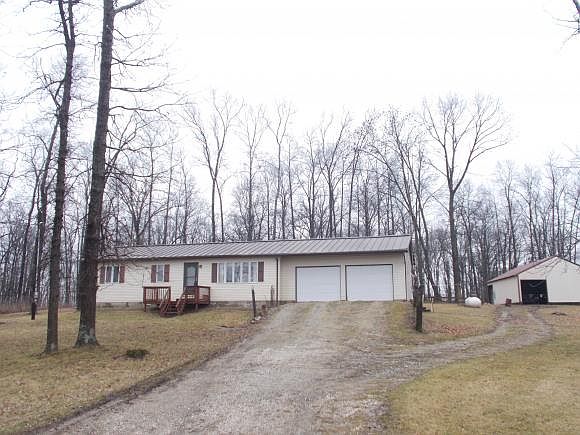 NESTLED in 14 acres of hard wood timber. This ranch home has walnut and hickory trees surrounding the area.The home is a three bedroom, one bath ranch with a two car attached garage and a detached shed. The property has a meandering brook running through the eastern side and a great view overlooking miles of farmland on the north side. The vinyl siding and the metal roof make the upkeep more minimal to the new owner.