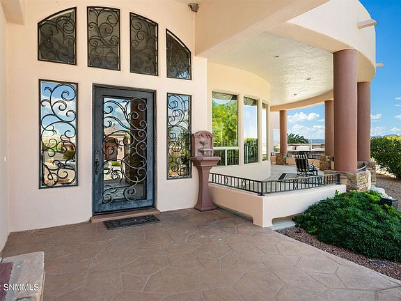 Exquisite, custom-built, Tuscan masterpiece situated to capture the breathtaking vistas beyond. This grand, warm, & inviting home welcomes you with soaring ceilings, artistic columns & impressive architectural features. Curved lines & a one-of-a-kind expanse of windows in the living room will stop you in your tracks. The split floor-plan design is thoughtful & functional. Each bedroom features an en-suite bath & spacious closet. The kitchen will impress even the most fastidious chef with a huge pantry & patio access to make al fresco dining a breeze. A 3-car garage will house all of your cars & toys! With approx. 1,000 sq. ft. of outdoor living, you'll be able to appreciate Southern NM living from daybreak to sunset. Unmatched, elevated views from the front patio set this home apart. The lush backyard is complete with grass, a water feature & a dazzling pergola perfect for wine & stargazing. The Owner's suite & bath are suited for fine living & comfort with an exterior door and dual-sided fireplace.
