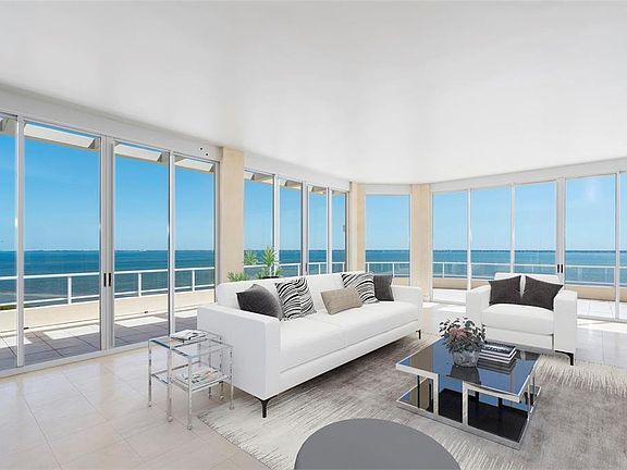 One or more photo(s) has been virtually staged. RARE OPPORTUNITY Top of The World PENTHOUSE. Boasting an astounding 5,300 square feet of wraparound terrace space and floor-to-ceiling walls of glass throughout, this extraordinary Grand Bay penthouse showcases a dazzling panorama of bay, Gulf, golf course, marina and downtown vistas. Wake up to gorgeous sunrises over Sarasota Bay and delight in captivating sunsets over the Gulf of Mexico and sweeping unobstructed views at every turn. A private elevator whisks you to the 4,400-square-foot residence's 10th-floor entry, where double glass doors open to jaw-dropping views through three walls of floor-to-ceiling sliders in the voluminous living room/dining area. Multiple glass doors seamlessly integrate the indoor space with the enormous main terrace, making it perfect for large-scale entertaining, intimate gatherings, relaxing and dining. A large gazebo is already in place, and options abound for making the rest of the sprawling outdoor space your own. Inside, you will find soaring ceilings, three bedrooms with en-suite baths, a den and kitchen - all offering magnificent views. Infused with natural light, the kitchen features granite countertops, custom cabinetry, island cooktop, spacious breakfast area and an adjacent butler's pantry. A lavish retreat awaits you in the massive bay-facing owner's suite, featuring two generously sized marble bathrooms, each with a large vanity, soaking tub, walk-in shower, bidet and windows.