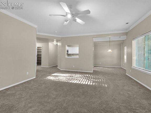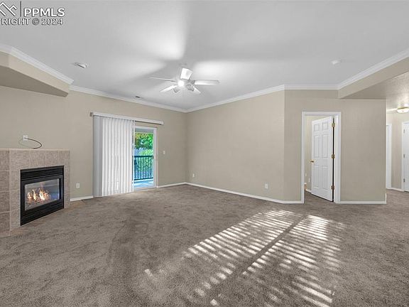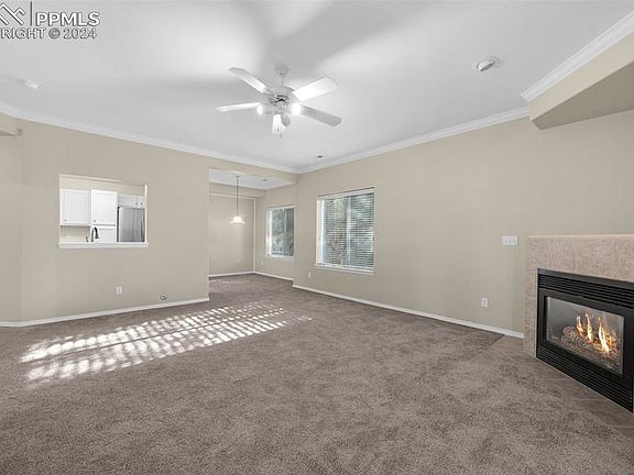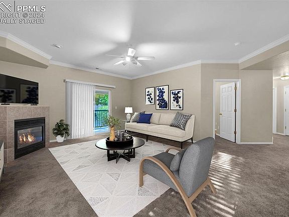 Spacious condo with great updates! Enjoy 9 ft ceilings throughout this inviting space, featuring a large family room with a cozy gas fireplace. The walkout slider opens to a covered patio, perfect for relaxing outdoors among mature trees and beautifully maintained landscaping. The refreshed kitchen boasts white cabinets and stainless steel appliances, with a convenient serving window to the family room. The dining room, living room, and primary bedroom all overlook an open space, creating a serene atmosphere. Retreat to the primary suite, a true haven with a unique bathroom layout that includes a tub, separate walk-in shower, dual sinks, and a walk-in closet. Two additional bedrooms share a full bath, providing ample space for family or guests. You’ll also find a washer and dryer in the spacious in-unit laundry room, along with plenty of storage options, including an oversized hallway walk-in closet for easy organization. This condo is not only clean and move-in ready, but it also boasts an amazing location in a quiet community, just a walking distance or a 5-minute drive to shopping, grocery stores, movies, restaurants, and multiple retail options. Enjoy easy access to North/South routes via Powers and East/West routes via Constitution, putting you just 5-25 minutes from anywhere in Colorado Springs. Don’t miss your chance to make this charming condo your new home! 3 virtually staged photos uploaded.
