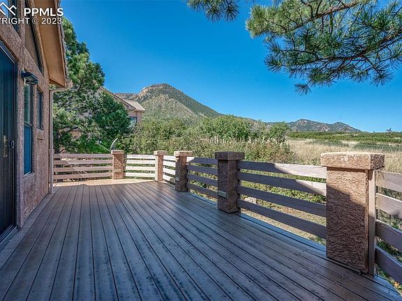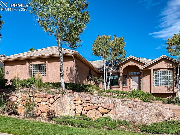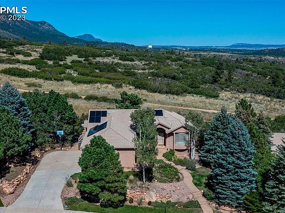 This is a rare opportunity in the desirable Talon Ridge neighborhood of Peregrine!! Custom built ranch style home backing up to thousands of acres of Air Force Academy land!! There are unobstructed views of Blodgett Peak, Pike National Forest, Mountain and City Views. Yes, the home does need updating but it is a great place to start. Reap the Benefits of 6720-watt PV SOLAR Installed in 2020. You'll love this easy living floor plan designed to take advantage of this amazing setting with views from almost every room on the main level. The entire main level features an easy living floorplan. Main level living and a convenient floorplan that includes a covered entry, formal dining room, main level office with views and French doors, hardwood floors in the great room and the kitchen, high ceilings throughout, a gas fireplace, built-in entertainment center with thoughtful niches, and recessed lighting. Lots of cabinet space in the kitchen and storage closets in the basement, where there's an additional built-in entertainment center and sink in the family room area. Main level master features 2 walk in closets, large windows with expansive views and an en-suite 5 pc bath. Also, in the basement are 3 additional bedrooms with walk-in closets and each access to an ensuite bathroom. Bedroom 2 has a private bath. Bedrooms 3 and 4 share a jack and jill style bathroom with private sinks. There is also a large unfinished area for storage, workshop, or whatever. The large wraparound deck features a separate step down to another 12x13 deck and area that is setup to hold a hot tub. The large 3 car garage is almost 800 sq ft. The regional building website shows that the 6720-watt PV solar system was installed in 2020, and the furnace and water heater were installed in 2021.