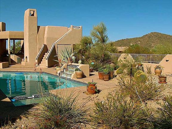 Extremely quiet interior/cul-de-sac lot! Great Room w/fireplace,many lighted art niches, formal dining room, private back yard w/htd pool & spa, 'Brand New' gourmet kitchen w/stainless steel appliances & granite slab counters, Home maintained extremly well - even 'Dryvit' Stucco - no cracking! Every bedroom has access to pool area! Separate Guest Casita! Roof-top view Deck looks directly at Lone Mtn! Seller motivated make offer! Furniture avialable for sale under sep contract