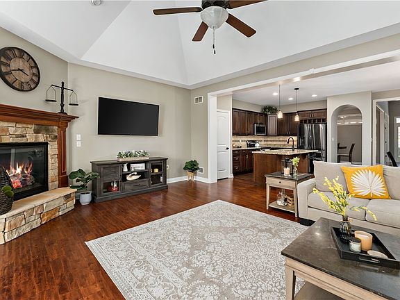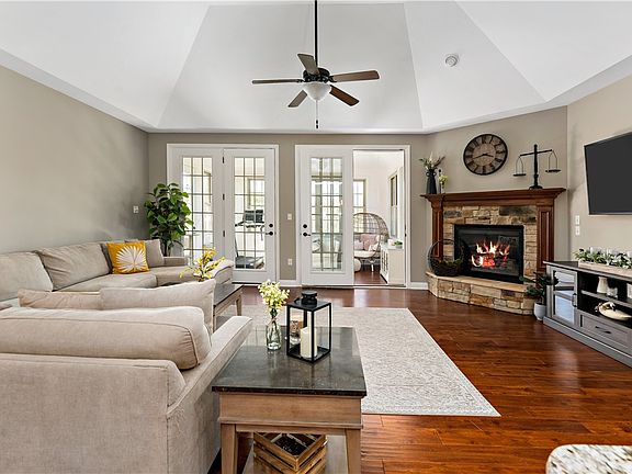 Pristine custom-built Carriage Home in the desirable, low-maintenance community of The Gables at Brickyard Hill. Ideally situated on a private cul-de-sac! This move-in ready home showcases gleaming hardwood floors throughout the main level, a gourmet kitchen w/granite countertops, stainless steel appliances and large island. Vaulted Family Room w/stunning stone gas fireplace and 9 ft French doors leading to a bright 4-season Sunroom w/electric baseboard heat and built-in speakers. Enjoy peaceful, wooded views from the low-maintenance deck. The 1st Floor Primary Suite offers a spa-like bath with double vanity, jetted tub, ceramic shower, and walk-in closet with organizers. Upstairs includes two spacious bedrooms and full bath. Finished walkout lower level features a wet bar, large game room area and perfect in-law space w/full bathroom! Fully fenced in backyard! Oversized 2-car garage with 2 ft ext. Direct backyard access to scenic walking trails, w/ access to the clubhouse and pool!