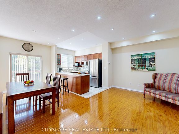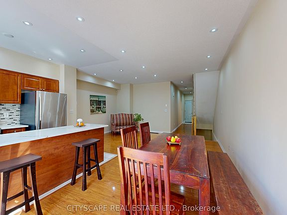 A rare offering and opportunity to own a beautifully maintained 3-storey executive townhome in the highly desirable Harmony Village community. This spacious 4-bedroom, 5-bathroom home offers over 2,200 sq ft of well-designed living space perfect for growing or multigenerational families. Step inside to a bright, open-concept main floor featuring soaring ceilings, expansive windows, and stylish upgrades throughout. The contemporary kitchen is equipped with stainless steel appliances, upgraded quartz countertops, a modern backsplash, an enhanced range hood, and generous cabinetry. A walk-out leads to a private balcony overlooking serene greenery ideal for morning coffee or hosting guests. Enjoy the luxury of two primary suites, complete with private ensuite bathrooms and his & hers walk-in closets, offering flexibility and comfort for any living arrangement. The finished basement with high ceilings adds even more functional space, perfect for a rec room, home office, or fitness area. Additional highlights include a private garage with driveway parking, low monthly maintenance fees, and unbeatable convenience. Located just steps from schools, parks, TTC transit, Metrolinx, and shopping, with easy access to Highways 400/401, York University, and Humber College this home effortlessly blends space, comfort, and location.