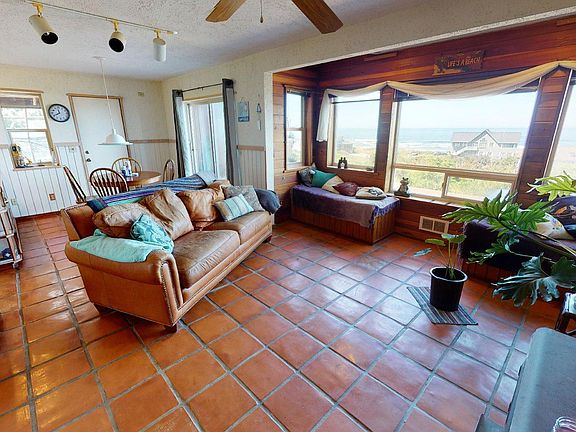 Panoramic ocean and Rogue Reef views & deeded beach access! Terracotta tiled floors in most living areas (easy sand cleanup) and tons of light from all the ocean facing windows. Oversized master bedroom with walk in closet and private deck. Family room was added (with permits) over the garage and features a beautiful vaulted tongue and groove wood ceiling. Two car garage with openers and a ton of storage in the basement AND a sauna. With a little updating, this could be a wonderful investment.