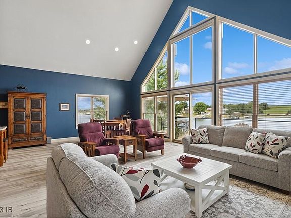 Stunning turn-key walk-out home with amazing views on Sun Valley Lake. This 3 bdrm, 2 1/2 baths features an open floor plan with stone gas fireplace & vaulted ceiling in great room. Professional design elements w/ comfortable interior gathering areas & several exterior relaxation spots for gorgeous sunsets. Finished basement. large loft for additional space. Walk into your zero entry home either from scenic deck side or into your updated mud-utility room. newly updated air & furnace, painted inside & out, new deck & railing, updated kitchen w/ Cambria Quartz countertops. This home is immaculate & move in ready with all furnishings included. Property includes 2 slip boat dock, pontoon & fishing boat, golf cart & shed at nearby golf course. 2 car detached garage w/ storage loft. Spring fed lake excellent for fishing and recreational boating. Just 1+ hours from WDM and 2+ hours from KC! You don't want to miss out on this one! See attachment for extensive list of items being left with home.
