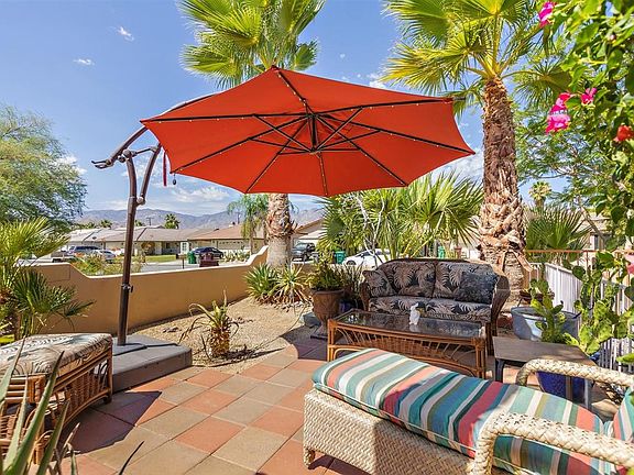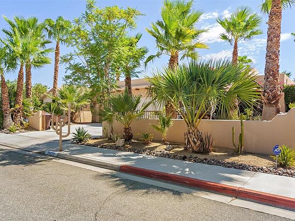 Come enjoy this captivating private backyard oasis & splash in your sun-drenched salt water pool & spa. The backyard features majestic matured palm trees, lush landscaping, extravagant outdoor space for entertainment & family gatherings; it is simply an outdoor haven. This beautiful 3 bedroom 2 bath home is nestled a short 7 miles from downtown Palm Springs. The home is 1766 of interior square feet with a unique open floor plan. The home is designed so you can see the pool or the luxurious backyard from many spaces within the home. Lots of windows & sliding doors carry in the natural light. The kitchen features bright white quartz countertops with an elegant dining area & separate breakfast space. Retreat & relax in your master bedroom. Enjoy the large walk in the closet. The ceilings are over 9 feet tall with a brilliant smooth finish. Sit in your well designed front courtyard. Insulated new garage door & other upgrades throughout. Plus a bonus room with shower and vanity with separate entrance. Home equipped with solar. Big savings on your annual electric bill. Make this your first home, second home, or GREAT vacation rental. Welcome home!