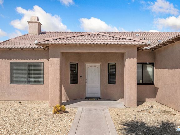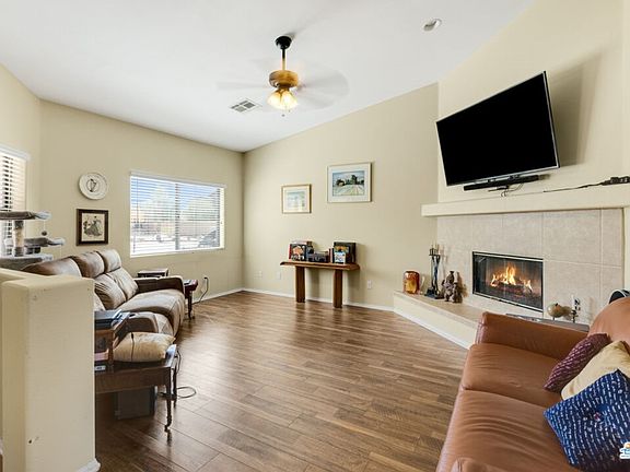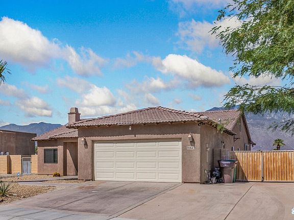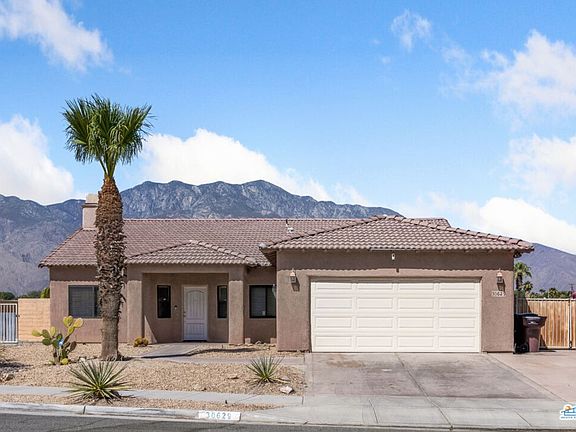 Located in a quiet cul-de-sac you'll find this generous sized Spanish Contemporary home. 4 bedrooms / 2 baths semi-open space accentuated by vaulted ceilings. Upon entering you have a welcoming living room with gas fireplace as the focal point. Just beyond a large kitchen with stainless steel appliances, granite countertops, and overlooking a separate eating area leading to the covered patio and backyard. Primary bedroom with en-suite bath and backyard access plus three more bedrooms (one with bookshelf Murphy bed and one additional bathroom complete the space. 2 car garage with separate laundry area within the home. Once outside sweeping western views of the San Jacinto Mountains to be enjoyed day and night from the covered patio or stone fire pit welcome you. Paved area on side of home for RV parking with hook-ups. Close to Sunny Sands Elementary School as well as Cathedral City shopping and services. Bring your vision and make this home yours