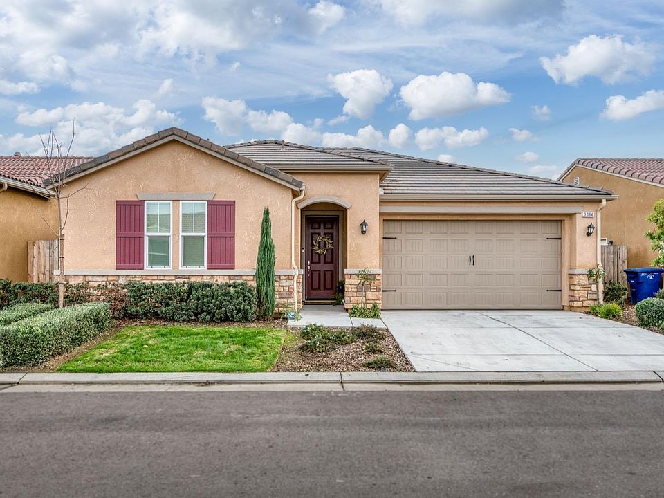 This 3 bedroom 2 bath Wilson home is a great little starter home, conveniently located near the Reagan Educational Center of Clovis Unified School District. Perfectly setup for entertaining, this home features a bright, airy and wide open great room consisting of the living and kitchen areas. There are extra tall ceilings, a spacious kitchen island, stainless steel appliances, bright eating area overlooking the backyard and patio, granite counters and a gas stove with built-in microwave. The primary bedroom is located in the back with a spacious walk-in closet, oval soaking tub and good sized shower with seating bench. The other two bedrooms are located towards the front as well as the hall bath, with a convenient laundry room/closet adjacent to the hall bath. There are extra built-in storage cabinets in each of the hallways. You'll be able to enjoy more of your off-time, as the HOA takes care of the front landscaping maintenance and sprinkler system. A tankless water heater will help with energy efficiency. Located conveniently in a 2 minute commute to Freedom Elementary and Reagan Educational Center.