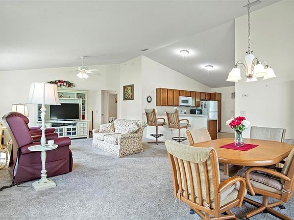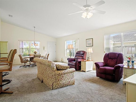 NEW ROOF OCTOBER 2022**2012 YAMAHA GAS GOLF CART INCLUDED**Partially FURNISHED 3/2 TUCKETT INN II COTTAGE RANCH HOME with a 2 CAR GARAGE located in the highly sought after Village of SANIBEL. (See list of items that don't convey in the paperclip) VAULTED CEILING and an OPEN FLOOR PLAN make for a light and bright feel. The kitchen has newer appliances (except the stove and dishwasher are original). INDOOR LAUNDRY in the kitchen and the washer/dryer stay with the home. Enjoy your morning coffee at the kitchen island/eat in kitchen or out in the screened lanai. Master bedroom has an ensuite bathroom and a walk in closet. Guest bathroom has tub/shower combo. 2nd and 3rd bedrooms have carpet and closets. SANIBEL neighborhood RECREATION center/MAIL STATION and POOL is right up the street. Other nearby recreation centers include: CAPTIVA, BRADENTON, MANATEE. BONIFAY Golf & County Club is 0.4 miles away. SARASOTA Golf Practice & Driving Range is 0.8 miles away. WALMART Neighborhood Marketplace/PUBLIX plus many other restaurants and shopping are 1.5 miles away. BROWNWOOD Town Square is 3.2 miles away and LAKE SUMTER LANDING is 3.4 miles away. This neighborhood has weekly events including Mens Golf/Womens Golf/Nine & Dine/Bocce ball/Mah-Jongg & so much more. Don't forget to click on the virtual tour link!