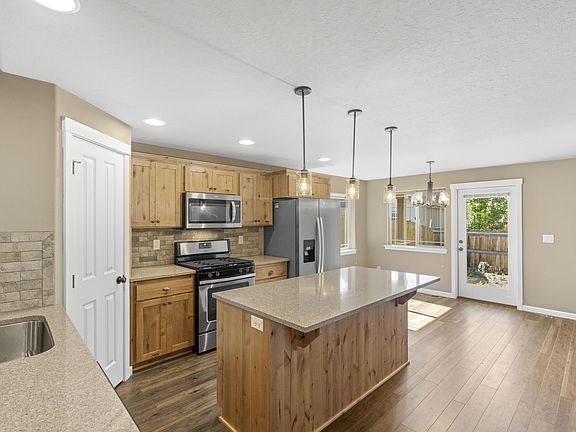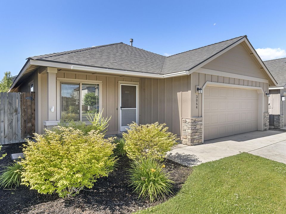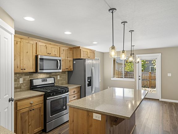 This beautiful Craftsman home welcomes you with a covered patio & rock accents as you enter the home! Inside, you'll be greeted with an open floor plan, ideal for modern living. Enjoy the warmth & ambiance of the stacked rock fireplace in the winter, & AC in the summer to keep you cool. The kitchen is a delight with its stainless-steel appliances, Hickory cabinets, gas stove, solid surface counters, kitchen island, pantry & an additional eating area off the kitchen. You'll find attractive laminate floors throughout the main living space, which flow into carpeted bedrooms for cozy toes in the mornings. The primary bedroom has a walk-in closet & double vanities in the bathroom. The front yard is nicely landscaped & has sprinklers for easy maintenance. In the back is a covered patio for relaxing & sipping your favorite beverage. The backyard itself is a blank slate offering endless possibilities for your creative design!