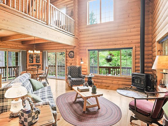 Pristine & tranquil log home on Bee creek w/wrap around covered porch. Main: Kitchen & open concept living areas w/light-filled, soaring vaulted ceiling, gorgeous heart pine flooring & propane stove, bedroom w/walk-in closet, Huge family room w/propane stove, full bath & laundry rm. Upper: Loft, full bath & generously sized primary bedroom w/walk-in closet & sitting area. 2 expansive decks to enjoy nature & entertaining. Beautiful, natural landscaping. Covered RV/boat parking.
